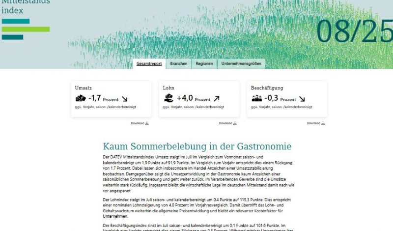Der DATEV Mittelstandsindex Umsatz steigt im Juli im Vergleich zum Vormonat saison- und kalenderbereinigt um 1,9 Punkte auf 91,9 Punkte. Im Vergleich zum Vorjahr entspricht dies einem Rückgang von 1,7 Prozent. Dabei lassen sich insbesondere im Handel Anzeichen einer Umsatzstabilisierung beobachten. Demgegenüber zeigt die Umsatzentwicklung in der Gastronomie kaum Anzeichen einer saisonüblichen Sommerbelebung und geht weiter zurück. Im Verarbeitenden Gewerbe sind die Umsätze weiterhin stark rückläufig. Insgesamt bleibt die wirtschaftliche Lage im deutschen Mittelstand damit nach wie vor angespannt.