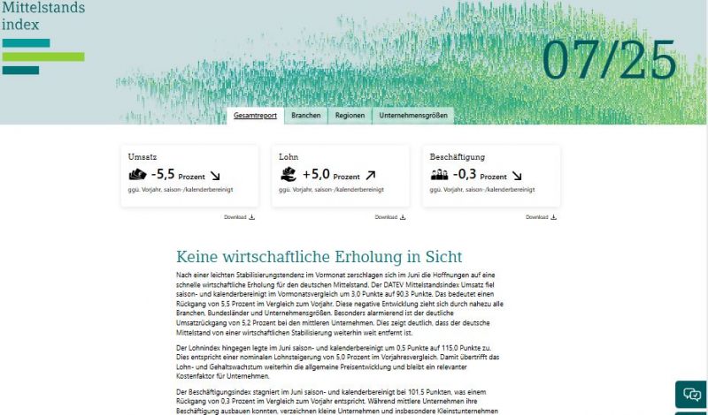 Nach einer leichten Stabilisierungstendenz im Vormonat zerschlagen sich im Juni die Hoffnungen auf eine schnelle wirtschaftliche Erholung für den deutschen Mittelstand. Der DATEV Mittelstandsindex Umsatz fiel saison- und kalenderbereinigt im Vormonatsvergleich um 3,0 Punkte auf 90,3 Punkte. Das bedeutet einen Rückgang von 5,5 Prozent im Vergleich zum Vorjahr. Diese negative Entwicklung zieht sich durch nahezu alle Branchen, Bundesländer und Unternehmensgrößen. Besonders alarmierend ist der deutliche Umsatzrückgang von 5,2 Prozent bei den mittleren Unternehmen. Dies zeigt deutlich, dass der deutsche Mittelstand von einer wirtschaftlichen Stabilisierung weiterhin weit entfernt ist.