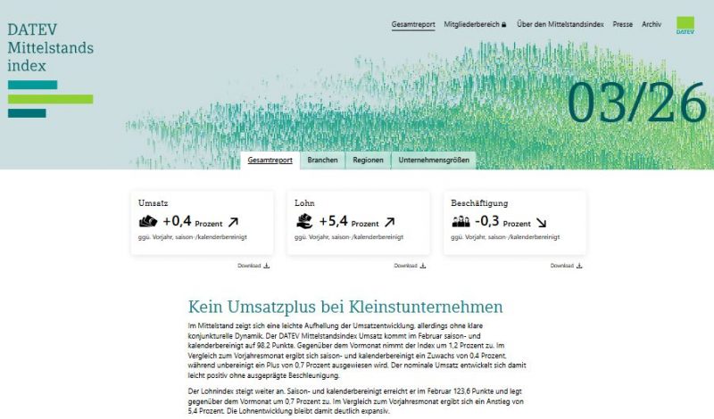 Im Mittelstand zeigt sich eine leichte Aufhellung der Umsatzentwicklung, allerdings ohne klare konjunkturelle Dynamik. Der DATEV Mittelstandsindex Umsatz kommt im Februar saison- und kalenderbereinigt auf 98,2 Punkte. Gegenüber dem Vormonat nimmt der Index um 1,2 Prozent zu. Im Vergleich zum Vorjahresmonat ergibt sich saison- und kalenderbereinigt ein Zuwachs von 0,4 Prozent, während unbereinigt ein Plus von 0,7 Prozent ausgewiesen wird. Der nominale Umsatz entwickelt sich damit leicht positiv ohne ausgeprägte Beschleunigung.